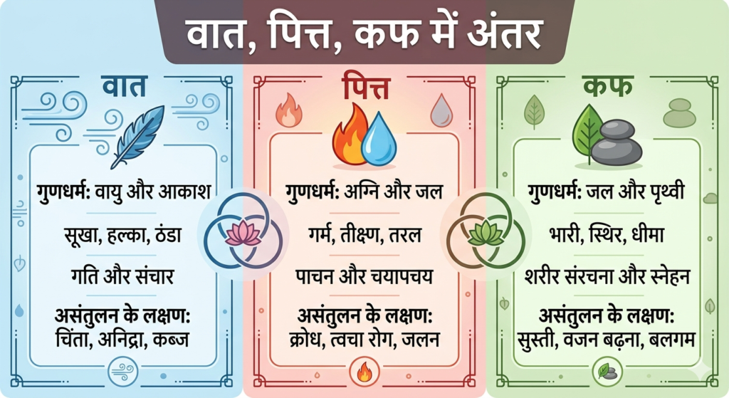 वात, पित्त, कफ में अंतर क्या है? (सरल तुलना )